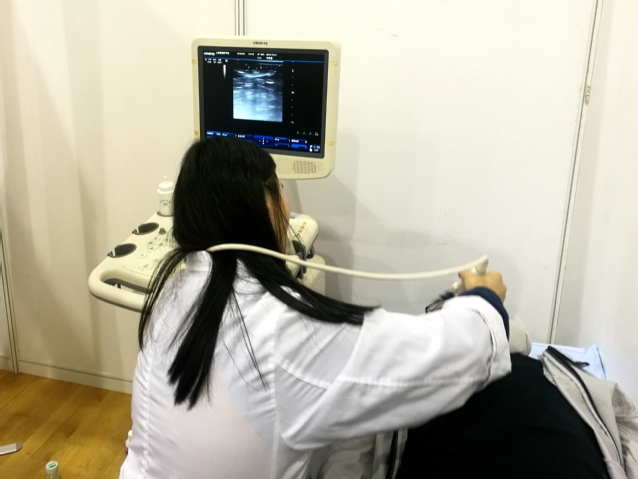 展出中更是出现了意想不到的状况。来体验超声的大一员工从展演开始前1个小时就大排长龙,志愿者们是应接不暇。更令人欣慰的是,在同学们的体验过程中,志愿者们还筛查出了一例疑似甲状腺囊样病变的无症状同学,朱晓红老师立即亲临现场,协助诊断,志愿者们通过手机联系该同学,建议前往医院确诊。