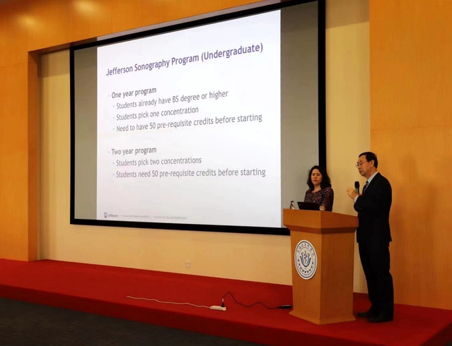美国托马斯•杰斐逊大学一行首先参观了公司现代医学教育博物馆、影像楼超声及CT实训室和分子影像重点实验室。Michael Dryer教授对公司的发展理念、建设水平、体现的医学人文精神表示高度赞赏。同时,健康人文科学公司终身教授刘吉斌、副教授Traci B.Fox为太阳成集团tyc9728员工作了关于超声检查技术发展的精彩讲座。
