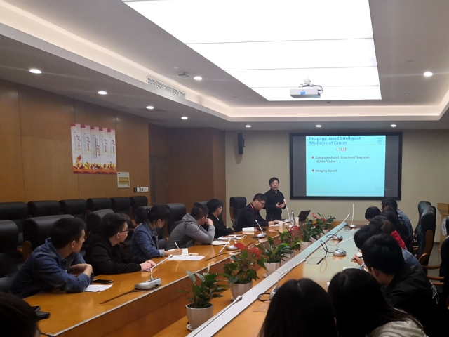厉教授聚焦于肿瘤影像基因组学研究,首先从计算机辅助诊断技术开始引入,介绍其在三个维度的发展,逐步引出什么是影像组学,该如何应用影像组学进行科学研究等问题,最后为大家讲解了影像组学的临床应用,并分享了最新的研究成果。讲座内容丰富有趣,涉及到众多影像组学方向的前沿课题,与在座众多师生的研究方向契合。会议结束后,在座教师与厉教授就课题申报、基金撰写以及科学研究中的细节问题进行了热烈的讨论,研究生们也针对自己的研究课题积极向厉教授请教学习。