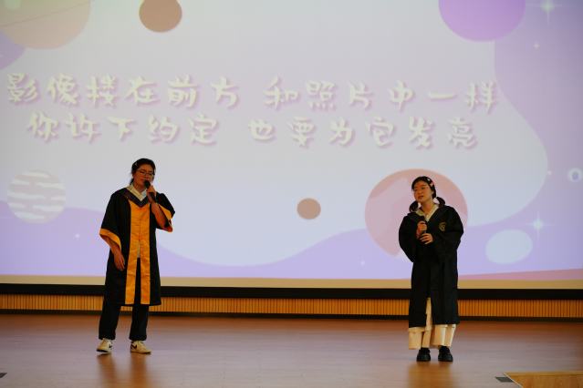 欢送仪式在一首欢快的歌曲中拉开帷幕。由21级医学影像技术1班王佳玲与24级医学影像技术专升本班卫紫琳同学共同改编和演唱的歌曲《有光》将现场气氛点燃。随后,毕业纪念视频中的一帧帧画面将大家带回过往的大学时光——熟悉的教学楼、实验室、操场,那些难忘的回忆让很多同学湿了眼眶。青春序曲奏响,回忆与祝福交织,说再见是多么不舍。