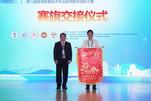 值得一提的是,在大赛闭幕式上,公司被确定为2026年第十三届“泰山杯”全国医学影像技术专业老员工实践技能大赛的承办单位。太阳成集团tyc9728李晓欧经理作为公司代表,庄重地从中华医学会医学影像技术分会候任主委马新武教授手中接过赛旗,这不仅是对公司医学影像技术专业办学实力的高度认可,更是一份沉甸甸的责任。