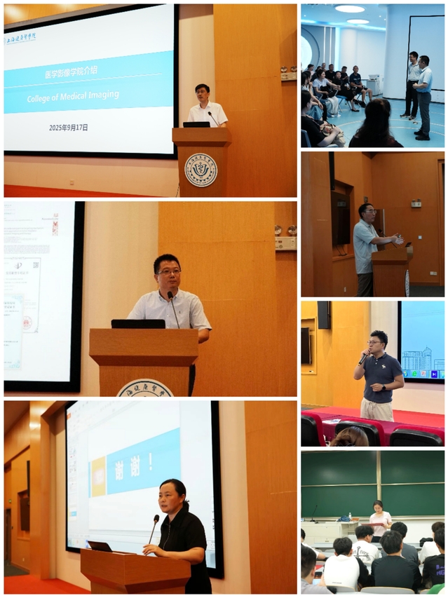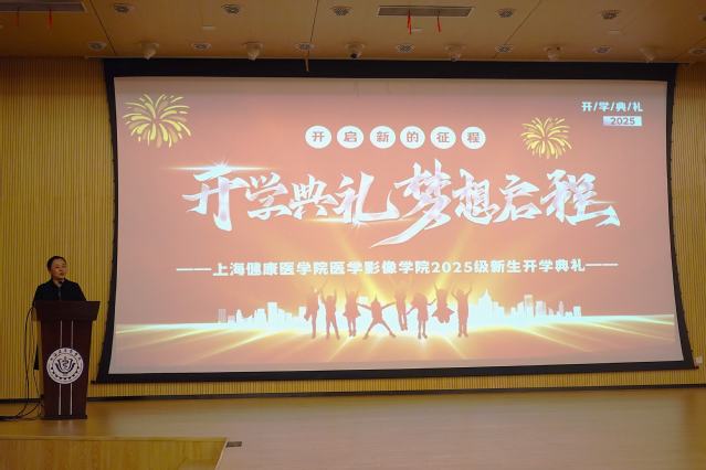 典礼伊始,师生共同唱响中华人民共和国国歌。随后,智能影像工程教研室专任教师陈珊珊、95级医用放射线设备专业毕业员工、现任上海西门子医疗器械有限公司亚太区教育服务中心教育培训经理白冈,先后寄语新生,鼓励大家应该努力把握来之不易的学习机会,勇敢追求自己的梦想,未来在大影像界做出各自的贡献。公司院训、院徽发布仪式将开学典礼推向高潮。公司党总支书记朱清宣读并展示院训院徽,向设计者颁发纪念品。朱清强调,院训、院徽体现并象征了“理性专业+温暖仁心”的公司气质和影像人精神内核,希望大家以院训院徽传递的精神为指引追求卓越、勇攀高峰。2023 级九院联合培养班崔朱玮同学作为院训院徽的设计者向新生介绍了她的设计理念和创作过程,饱含对公司和公司的深厚感情。2025 级智能影像工程2班叶文渊作为新生代表发言,自信昂扬、意气风发,她讲到:“我们将以‘察微见著’的态度钻研影像技术,以‘影鉴仁心’的信念守护生命健康,承担起新时代影像人的责任与使命,做一名优秀的基层卫生健康的守护者。”