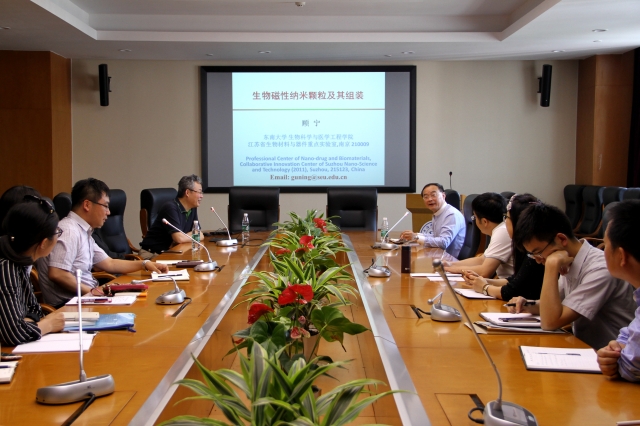 顾宁教授以生物磁性纳米颗粒及其组装为题,阐述最新的发展现状。顾教授的报告深入浅出、旁征博引,让在座老师深受启发。学术报告结束后,部分教师代表与顾宁教授就相关科研问题进行了互动交流,大家均表示收获很大。