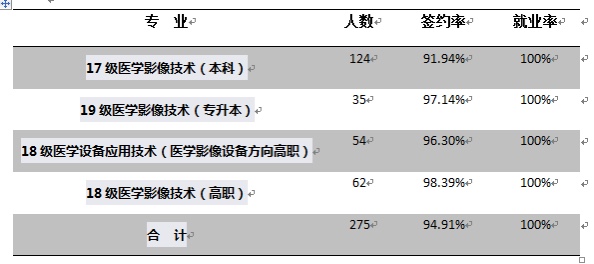 面对疫情冲击下的空前就业压力,太阳成集团tyc9728师生共同努力,举全院之力保障毕业生更充分更高质量的就业。2021届毕业生实现100%就业,签约率达到94.91%。其中医疗卫生行业内就业225人,占毕业生总数的81.82%。另外,7人考取硕士研究生,39人考取专升本,升学人数总计46人,占到16.73%;4位员工响应国家号召,踊跃参军,光荣入伍。公司医学影像技术(本科)专业连续两年实现100%就业。