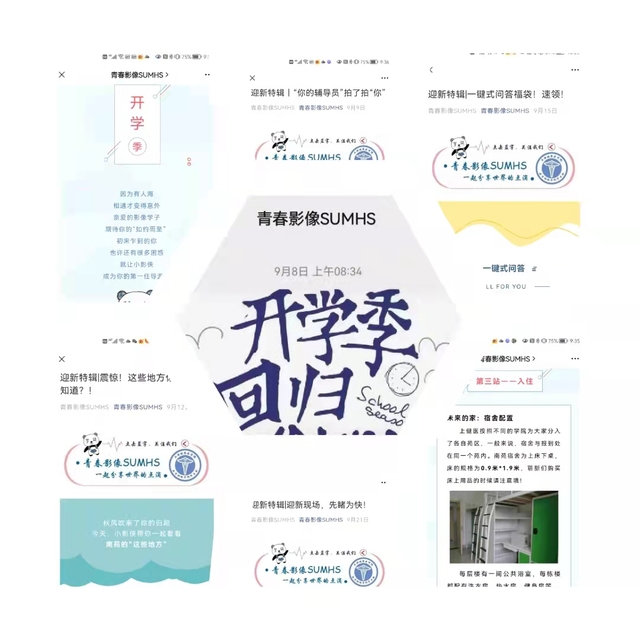 此外,公司团总支从9月初开始,陆续在青春影像SUMHS公众号推送迎新特辑系列内容,包括“美丽校园介绍”、“校园文化之创新创业活动展示”、“新生辅导员介绍”、“开学报到指引”、“与新生互动答疑”等,帮助新生提前熟悉校园、了解老员工活、认识公司老师,顺利开启老员工活。
