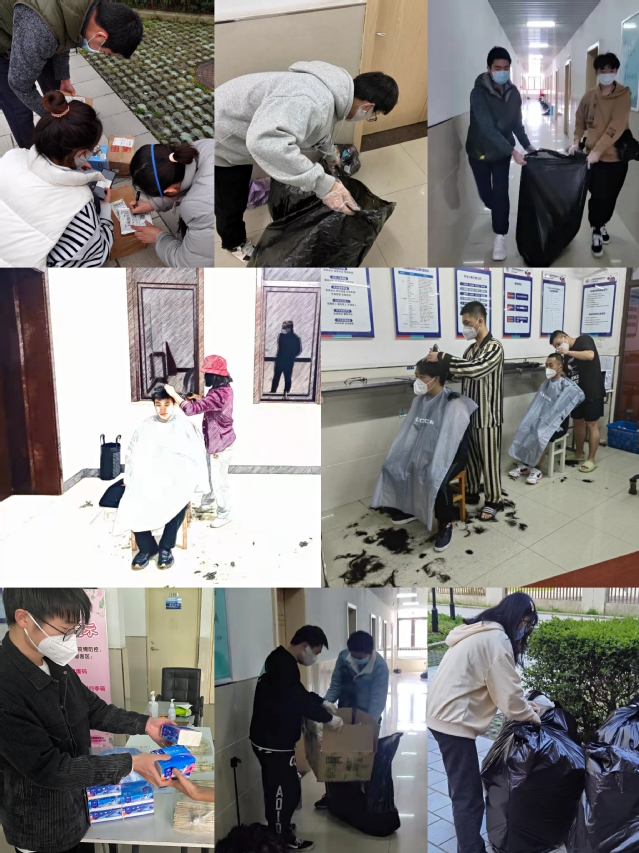 他们时刻准备着,听从值守老师的统一安排,主动发挥老师与同学之间的桥梁纽带作用。抗疫小纵队成员主要有:19级医学影像技术(本科)3班的赵一平、20级医学影像技术(本科)1班的王舒心、20级医学影像技术(本科)2班的龚鹏翼、19级医学影像技术(本科)1班的潘泽豪,以及18级医学影像技术(本科)2班的姜锐,还有他们各自组建的志愿者服务小队的同学们。平日里他(她)们深入同学当中了解大家的想法、主动关心身边同学,带头遵守校园管理规定,带头维护校园安全稳定,向身边同学宣传防疫政策,成为校园正能量的传播使者。紧急情况下,分布在不同楼栋内的志愿者服务小队就会立刻激活,补充到楼栋志愿者力量当中。他(她)们主动帮助隔离同学取送生活物资,和老师一起走访员工宿舍,了解同学们的学习生活情况,协助老师分发员工代购物品。他(她)们把校园当做自己的家园,同学们就是家人。发现楼栋里打包盒堆积太多,卫生间方便面盒汁水流出来,阿姨已经忙得不得闲,小队成员成功策划组织了“防疫有我,爱卫同行”的活动,带领一部分同学亲自体验一下阿姨的辛苦,以实际行动号召大家做好垃圾分类、并且及时清理,主动维护干净整洁的楼宇环境。发现老师和同学们的头发越来越长,号召公司身怀绝技的TONY老师积极加入苑区招募的团队,帮助解决同学老师的“头等大事”。