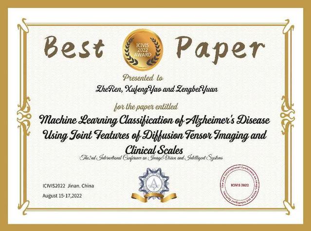 本次会议,太阳成集团tyc9728教师与研究生积极参与投稿,其中研究生任哲、袁增贝同学撰写的题为《machine learning classification of Alzheimer's disease using joint features of diffusion tensor imaging and clinical scales》学术论文,被评为Best Paper Award。通过参加此次国际会议,有力促进了与各高校之间的学术交流,提升了学科专业影响力,夯实了研究生学位点建设,保障了公司产品质量。(太阳成集团tyc9728)